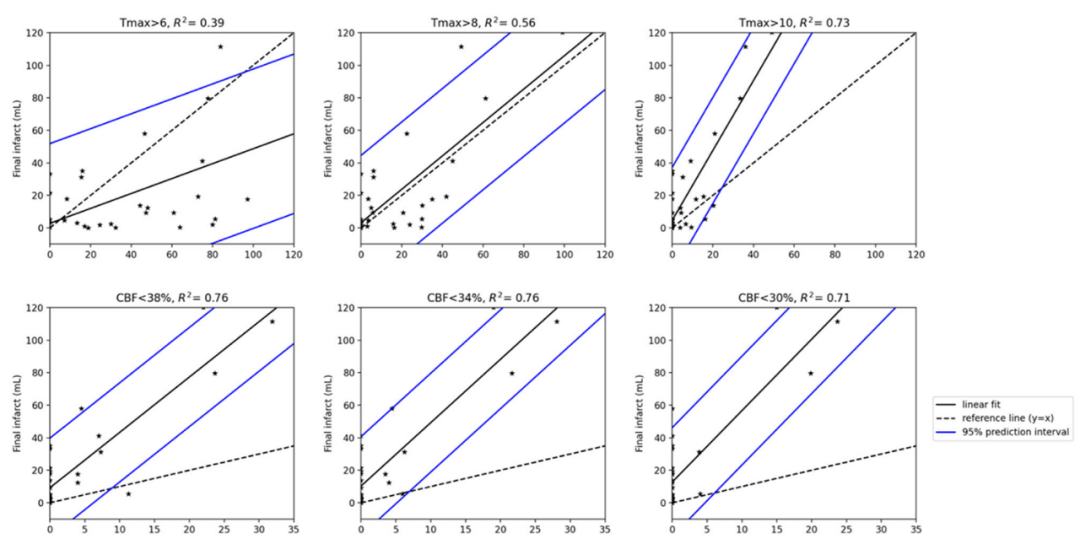 图2. 当Tmax>6s、8s、10s, CBF <38%、34%、30%时最终梗死体积(mL)线性回归图。黑色实线表示线性回归线,黑色虚线表示斜率1的参考线,蓝色实线表示95%预测区间。