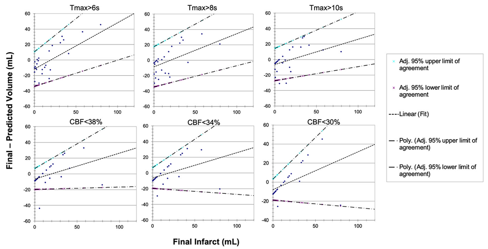 表3. 残差图显示的测量和估计最终梗死体积之间的差异。虚线为差异值的拟合线,虚线为调整后的95%预测区间。