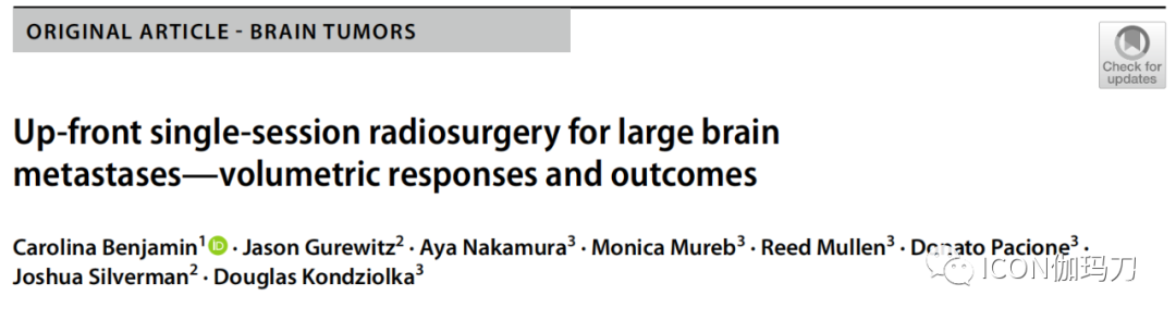 《Acta Neurochir (Wien)》杂志 2023年1月27日在线发表美国University of Miami Health System的Carolina Benjamin,NYU Langone Medical Center的 Jason Gurewitz , Aya Nakamura ,等撰写的《先期单次放射外科治疗大型脑转移瘤-体积反应和结果。Up-front single-session radiosurgery for large brain metastases-volumetric responses and outcomes》(doi: 10.1007/s00701-023-05491-z. )。