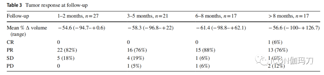 所有磁共振成像的层厚均小于或等于1毫米。对于伽玛刀放射外科时的肿瘤体积,用GammaPlan提供的体积测量。在随后的随访成像中,首先在每个层面上勾画出肿瘤区域,精确计算体积。然后,将每个层面上的肿瘤面积乘以层厚,并将所有结果相加。测量对比增强后的T1序列。用初始SRS治疗前体积减去随访时的体积(1-2个月、3-5个月、6-8个月、最终随访大于8个月)计算体积变化。然后计算肿瘤体积变化百分比。如果患者在一个时间段内有一次以上的随访,则使用最近的随访量。根据体积变化,将患者分为完全缓解(体积减少100%)、部分缓解(体积减少至少30%)、进展性疾病(体积增加至少20%)或疾病稳定(体积既没有显著缩小以符合部分缓解,也没有足够增加以符合进展性疾病)。所有随访均获得临床评估。个别随访情况见表2。
