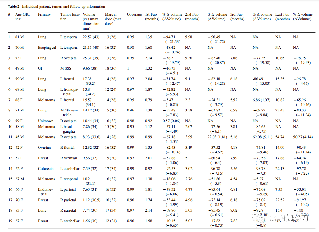 进行了一项机构伦理审查委员会批准的、符合HIPAA的回顾性研究。在我们前瞻性维护的接受伽玛刀放射外科(GKRS)治疗的临床登记中,2012年1月至2018年8月期间,945名患者接受了脑转移瘤治疗。在这项研究中,患者必须满足以下纳入标准:已知有全身系统性癌症和脑转移,最大直径≥2.7 cm。如果患者是单纯的囊性肿瘤或肿瘤已被切除,则排除在外。有30名患者被确定为符合条件,但有一名患者在复查肿瘤轮廓时被审查。从2013年8月到2018年6月,29名患者接受了伽玛刀放射外科(GKRS)。由于合并症、肿瘤位置或患者-外科医生偏好,这些患者被认为是较差的手术候选人。记录患者的人口统计信息,包括年龄、性别、原发癌症诊断、随访时间、功能状态和总生存期。同时记录肿瘤的位置、侧边和体积等特征。最后记录靶体积、边缘剂量、最大剂量、覆盖范围等治疗特征。表1总结了患者和肿瘤的特征。患者个体及肿瘤特征见表2。