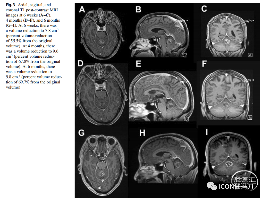 图3. 6周(A-C)、4个月(D-F)和6个月(G-I)的轴位、矢状位和冠状位T1对比后MRI图像。6周时,体积缩小至7.8 cm3(体积比原始体积减少55.5%)。4个月时,体积缩小到9.6 cm3(体积比原来减少了67.8%)。6个月时,体积缩小至9.8 cm(体积比原体积减少69.7%)。