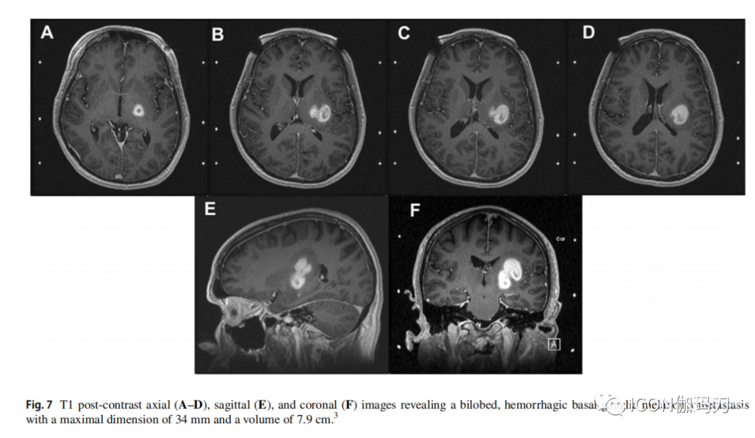 图7 T1对比后轴位(A - D)、矢状位(E)和冠状位(F)图像显示双叶状、出血性基底神经节黑色素瘤转移,最大尺寸为34 mm,体积为7.9 cm3。