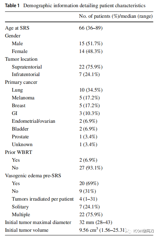 在29例患者中,69%的患者患有肺癌、黑色素瘤或乳腺癌。中位初始肿瘤大小(最大直径)为32 mm(范围28-43),中位初始肿瘤体积为9.56 cm3(范围1.56-25.31)。中位边缘剂量为16Gy(范围12-18)。中位最大剂量为32 Gy(24-36)。与SRS治疗前相比,1-2个月成像时肿瘤体积平均减少百分比为55%,3-5个月成像时肿瘤体积平均减少百分比为58%,6-8个月成像时肿瘤体积平均减少百分比为64%,>8个月时肿瘤体积平均减少百分比为57%;。SRS治疗后无立即的不良事件发生。SRS治疗后皮质类固醇的中位使用时间为21天。放射外科治疗后的中位生存期为15个月。