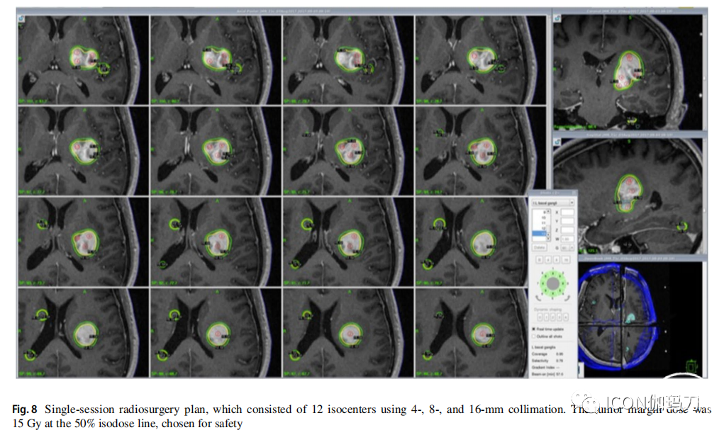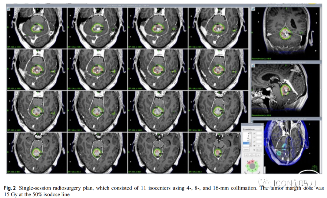 图2.单期放射外科计划,由11个等中心组成,分别采用4-、8-和16-mm准直。肿瘤边缘剂量在50%等剂量线上为15 Gy。