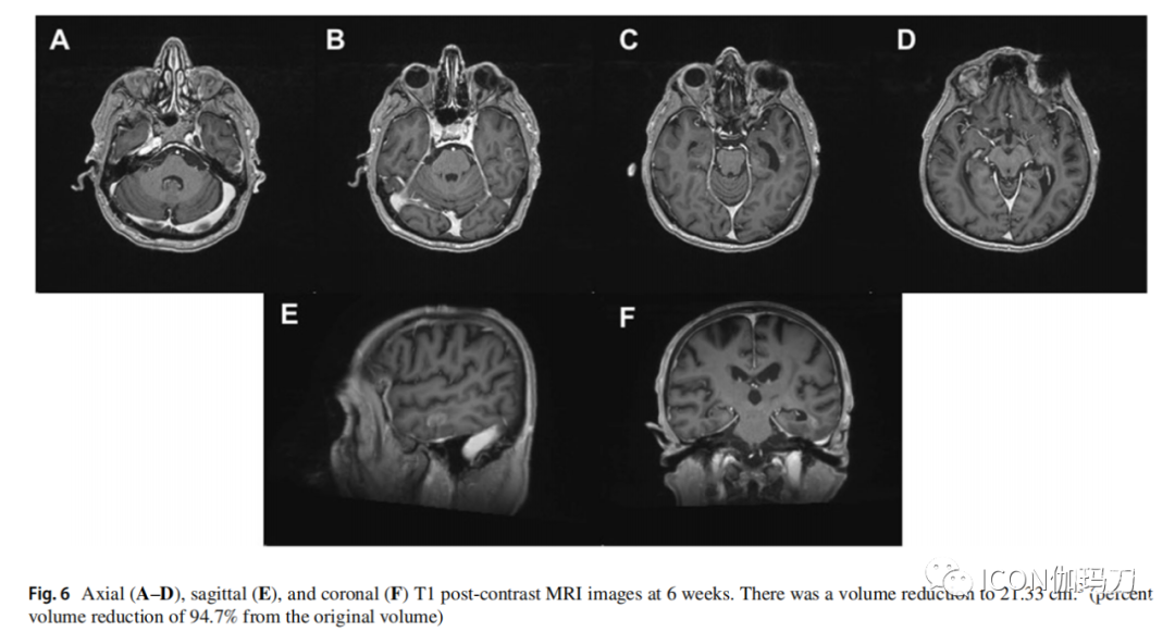图6。6周时轴位(A-D)、矢状位(E)和冠状位(F) T1对比后MRI图像。体积缩小到21.33 cm(体积比原体积减少94.7%)。