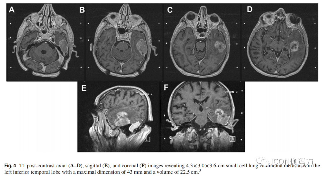 图4。T1对比后轴位(A - D)、矢状位(E)和冠状位(F)图像显示4.3×3.0×3.6-cm小细胞肺癌左侧颞下叶转移,最大尺寸为43 mm,体积为22.5 cm。