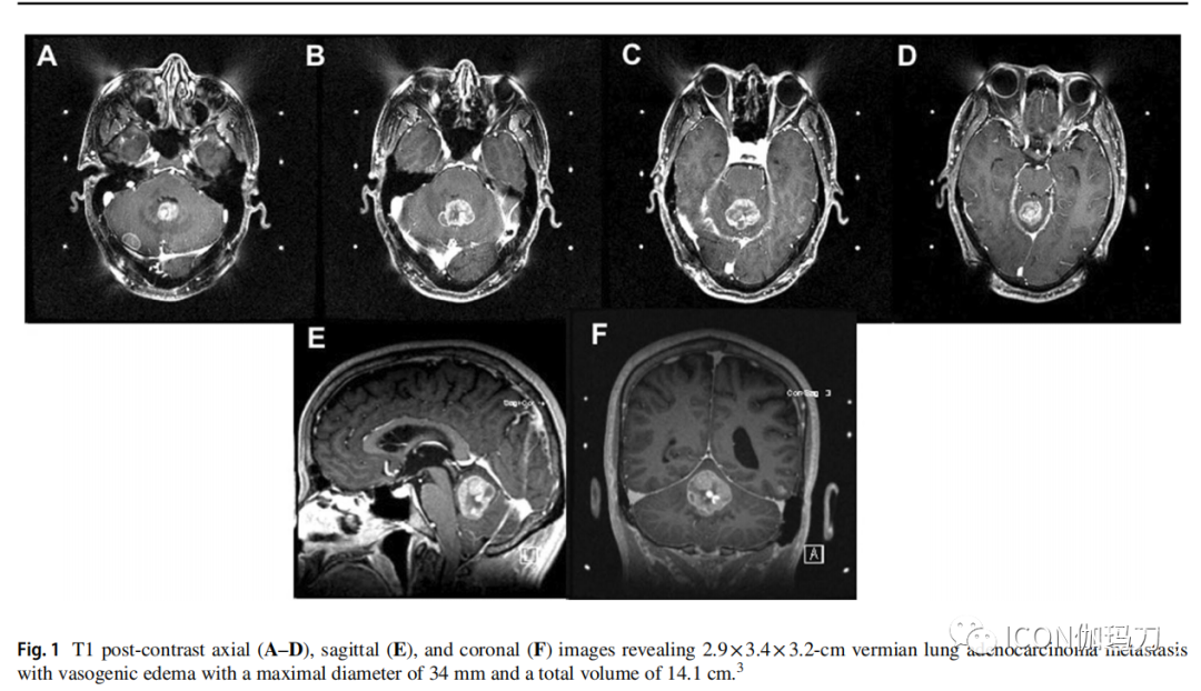 图1. T1对比增强后轴位(a - d)、矢状位(E)和冠状位(F)图像显示2.9×3.4×3.2-cm蚓部肺腺癌转移瘤伴血管源性水肿,最大直径34 mm,总体积14.1 cm。