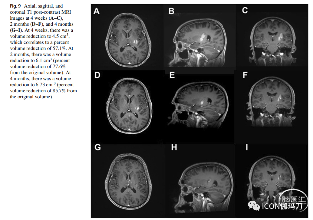 图9。4周(A-C)、2个月(D-F)和4个月(G-I)的轴位、矢状位和冠状位T1对比后MRI图像。4周时,体积缩小至4.5 cm3,体积减少了57.1%。2个月时,体积缩小至6.1 cm3(体积比原来减少了77.6%)。4个月时,体积缩小至6.73 cm3(体积比原体积减少85.7%)。