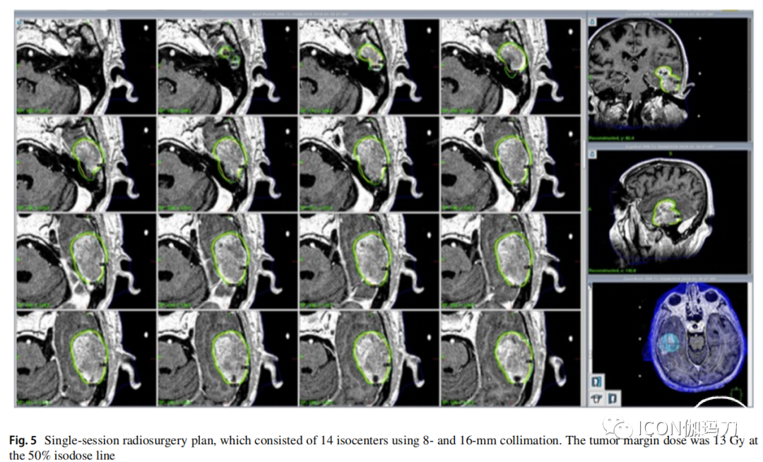根据我们的标准机构协议,所有患者使用(Elekta)Perfexion型或Icon型伽玛刀 进行SRS治疗。在吸入性局部麻醉下,采用四点固定将Leksell模型G立体定向支架固定于头部。然后选择合适的固定钉长度并安全地连接。患者行立体定向磁共振成像。获得体积采集对比增强的1毫米图像和长弛豫时间图像,并传输到伽玛刀计划计算机(GammaPlan软件)。然后进行剂量规划并对患者进行治疗。所有患者在治疗当天均接受10mg地塞米松治疗。(图1、2、3、4、5、6、7、8、9)。