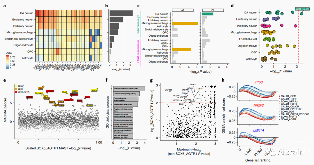 之后作者检测了人类SNpc中68个转录定义的亚群中PD常见变异风险的富集。使用两种不同的统计学方法,作者发现SOX6_AGTR1细胞亚型中PD遗传风险基因的富集最明显。