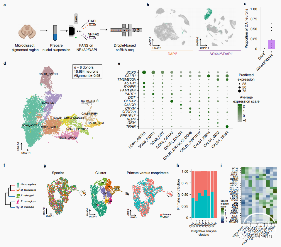 为了解决多巴胺能神经元分析相关的采样挑战,作者采用荧光激活细胞核分选(FANS)技术通过Nr4a2特异性富集人类中脑多巴胺能神经元核用于snRNA-seq。