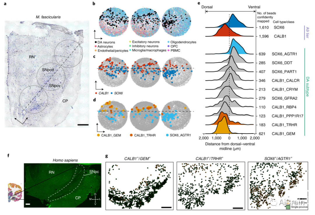 为了对人类snRNA-seq分析中定义的10个DA亚群进行空间定位,作者使用Slide-seq技术对食蟹猴SNpc的9个冠状切片产生的27个阵列进行分析。