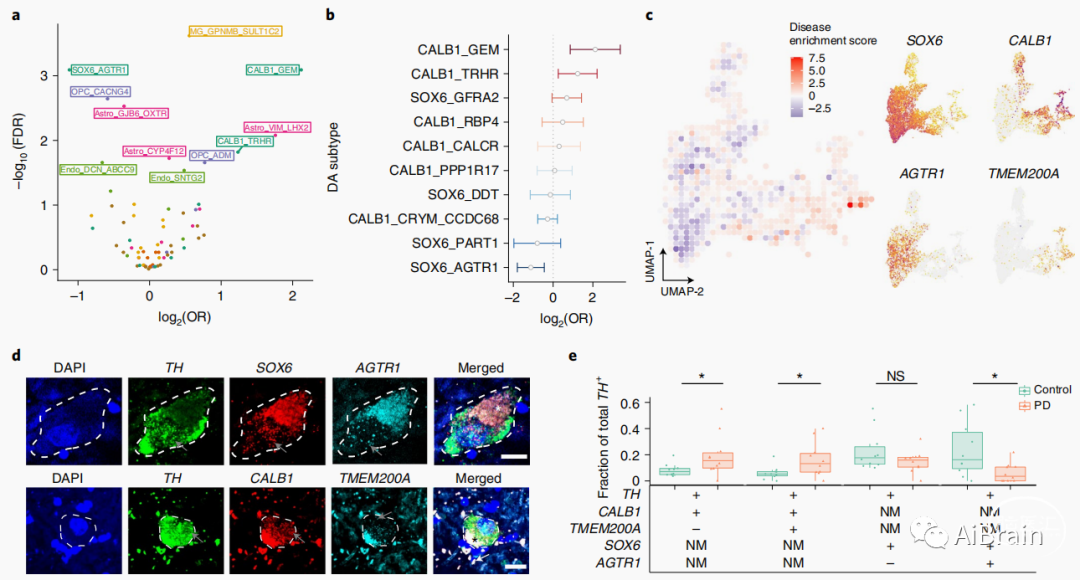 其中一种以AGTR1基因表达为标志且空间位置在SNpc腹侧层的单一亚型对PD的丢失高度敏感,并表现出TP53和NR2F2靶点明显上调,这表明了与变性相关的分子过程。