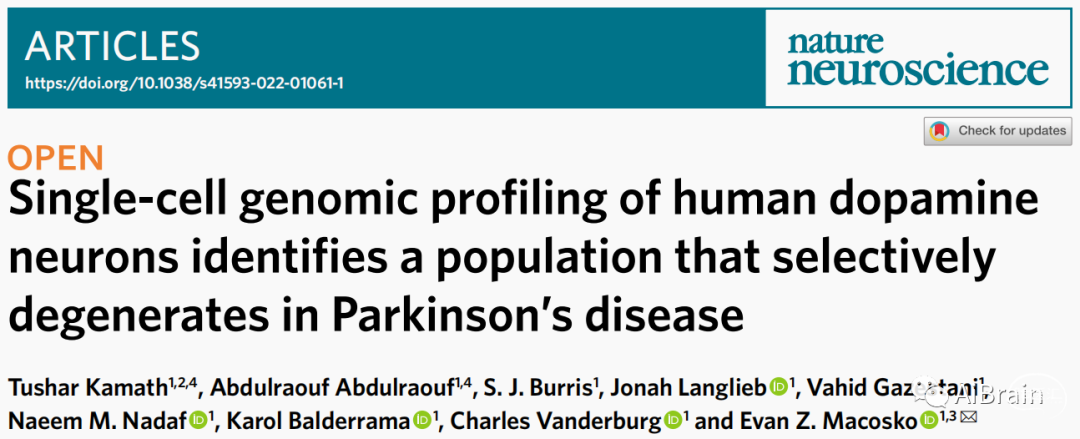 来自哈佛大学的研究团队在Nature Neuroscience上发表题为“Single-cell genomic profiling of human dopamine neurons identifies a population that selectively degenerates in Parkinson's disease”的研究文章,该研究团队开发了一种从人类尸检样本的SNpc中选择性富集多巴胺能神经元方案,该方案通过单核RNA测序(snRNA-seq)定义了十个转录不同的集群。然后使用Slide-seq(一种高分辨率空间转录组学技术)沿SNpc的腹侧层对这些集群进行空间定位。结果发现一类在PD病变中以ATGR1表达为标志的脆弱多巴胺能神经元。