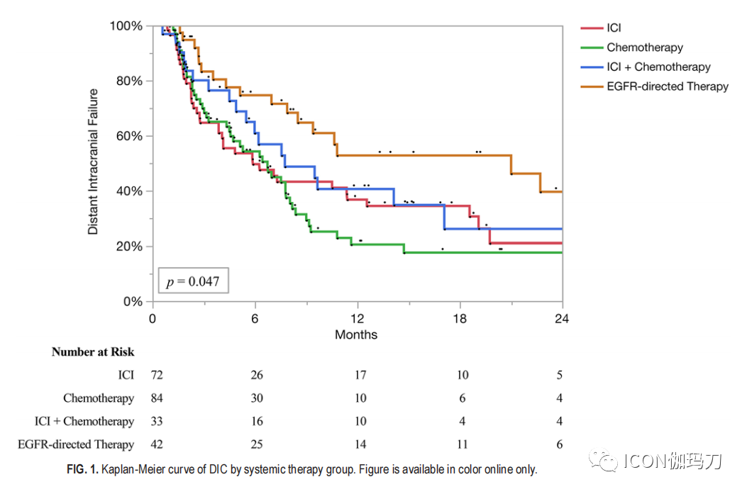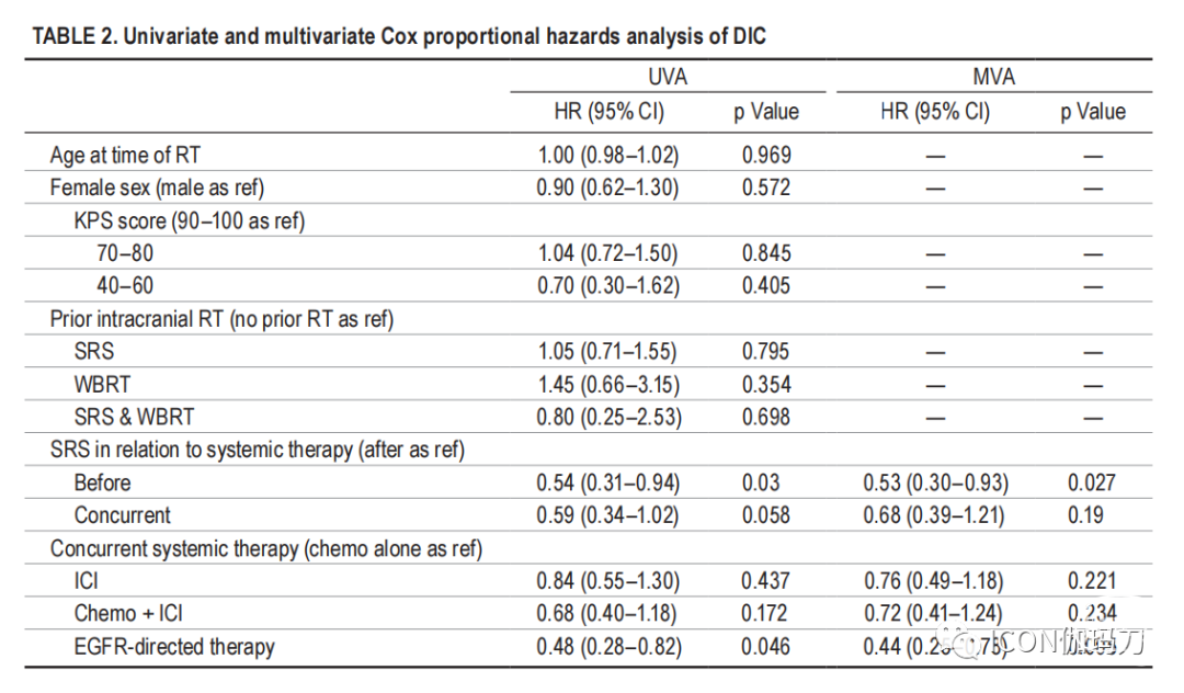 诊断BM后的中位随访期为8.9个月(范围0.3-127个月)。ICI组、EGFR-TKI组、ICI组和化疗组以及单独化疗组的12个月Kaplan-Meier的 DIC率分别为37%、53%、41%和21% (p = 0.047)。多因素分析显示,与常规化疗和SRS治疗相比,全身治疗前(HR 0.5, 95% CI 0.3- 0.9, p = 0.03), EGFR-TKI治疗后DIC改善(HR 0.4, 95% CI 0.3- 0.8, p = 0.005);与使用SRS治疗后相比,使用SRS治疗前(HR 0.4, 95% CI 0.2 -0.9, p = 0.03)或同步(HR 0.3, 95% CI 0.1 - 0.6, p = 0.003) LC(局部控制)有所改善。在放射性坏死方面,全身治疗的时机和类型无差异。