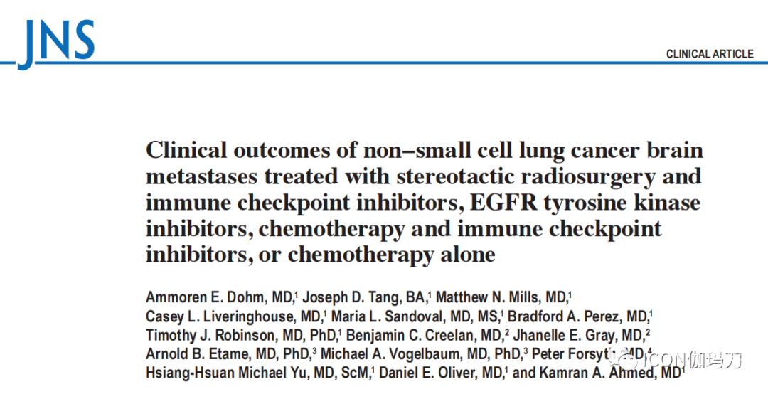《Journal of Neurosurgery》 2022 年12月 11日在线发表美国佛罗里达坦帕H. Lee Moffitt Cancer Center & Research Institute的Ammoren E Dohm , Joseph D Tang , Matthew N Mills , 等撰写的《立体定向放射外科和免疫检查点抑制剂、EGFR酪氨酸激酶抑制剂、化疗与免疫检查点抑制剂或单独化疗治疗非小细胞肺癌脑转移的临床结果。Clinical outcomes of non-small cell lung cancer brain metastases treated with stereotactic radiosurgery and immune checkpoint inhibitors, EGFR tyrosine kinase inhibitors, chemotherapy and immune checkpoint inhibitors, or chemotherapy alone》(doi: 10.3171/2022.9.JNS221896.)。