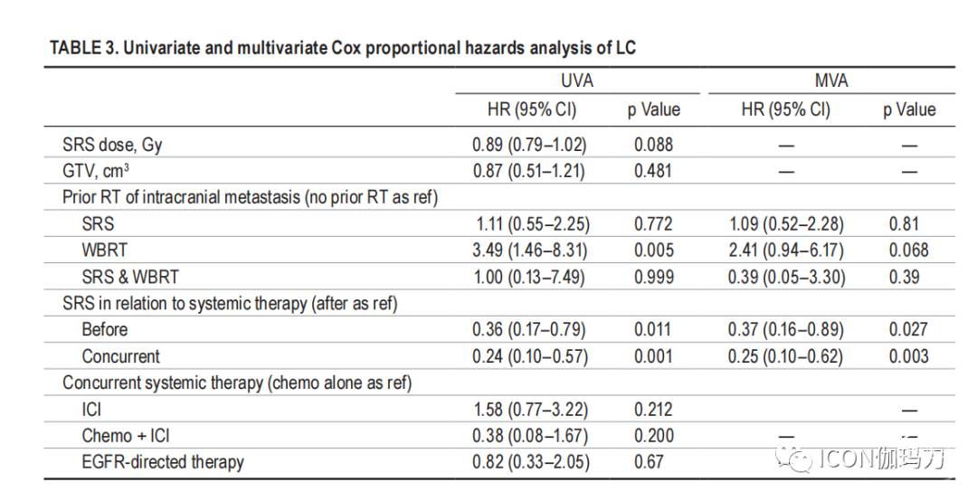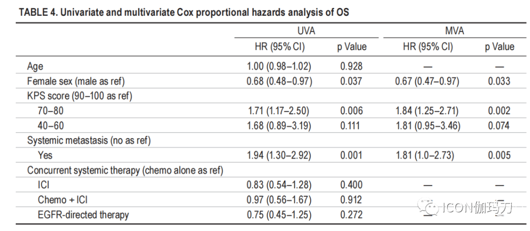 在本研究中,MVA显示在全身治疗前或同步进行SRS可显著改善LC,与全身治疗后的SRS相比,在全身治疗前进行SRS治疗可显著改善DIC。这些结果表明SRS治疗可能与全身治疗在大脑中具有良好的协同作用。提出的几种机制可以解释这些结果。SRS联合ICI/EGFR-TKI可能通过影响干扰素和血管内皮引起炎症反应增加 SRS可能导致死亡的NSCLC细胞释放新抗原,从而引发协同治疗性免疫反应。SRS还可能导致血脑屏障的打开,从而改善药物向中枢神经系统的输送。这些对大脑内免疫环境的综合影响可能导致LC和DIC的增加。然而,我们发现全身治疗组之间的LC没有差异,这也可能反映了无论接受哪种全身治疗,SRS治疗都能获得较高的LC。此外,我们发现全身治疗组OS无差异,但KPS和并发全身性疾病负荷等因素对MVA有显著影响。这一结果可能反映了这些临床因素在晚期NSCLC 伴BM患者中决定OS的相对更大的重要性。