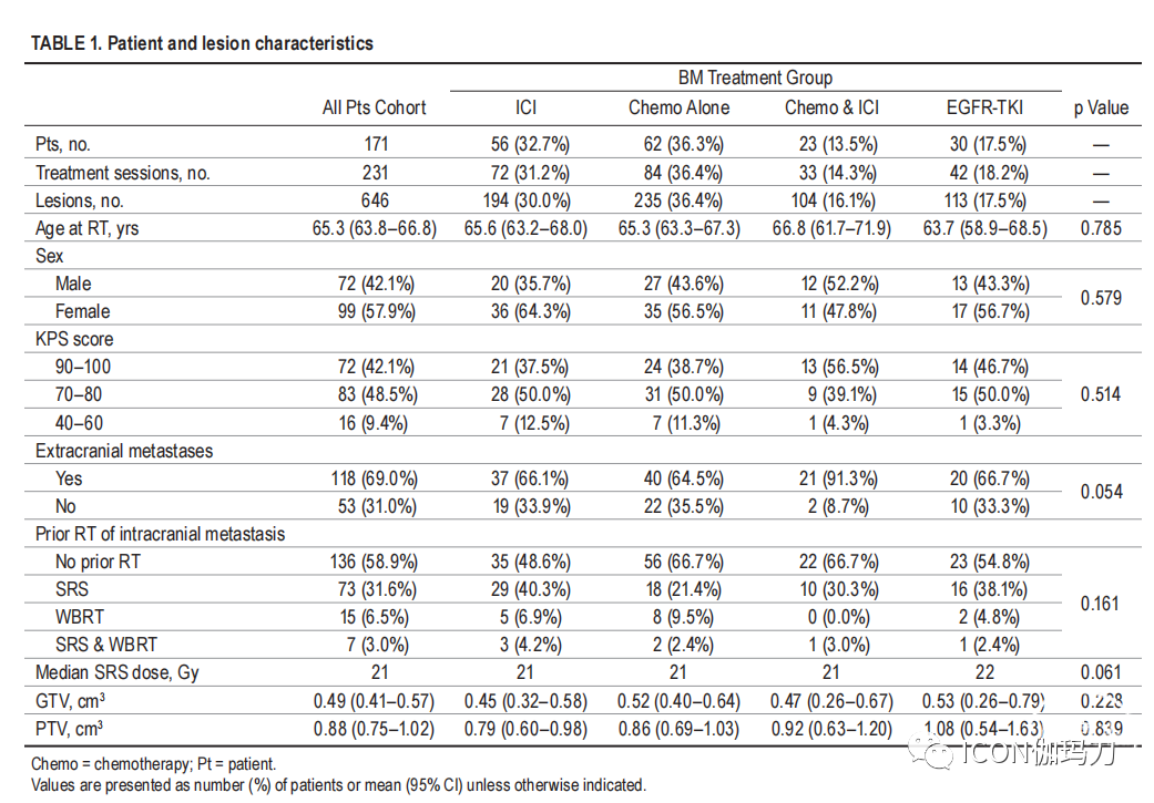 在2016年至2019年期间,作者确定了171例NSCLC BM患者,其中646例在接受ICIs治疗的3个月内接受单次SRS治疗(n = 56;33%), EGFR-TKI (n = 30;18%)、化疗和ICIs (n = 23;14%),或单独进行标准化疗(n = 62;36%)。进行时间-事件分析,结果包括远处颅内控制(DIC)、局部控制(LC)和SRS治疗的总体生存率。