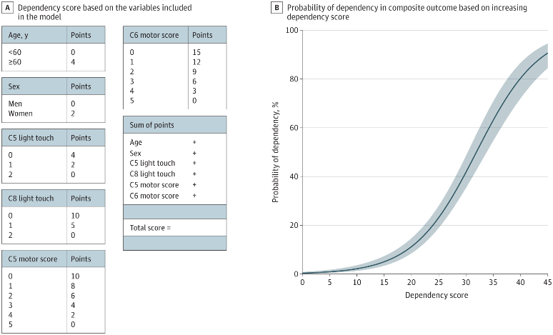美国脊髓损伤协会(ASIA)损伤分级(AIS)是SCI的主要分层标准,它与SCI患者的临床结局相关,但这一相对简单的量表却无法预测SCI患者复杂的神经恢复模式。目前关于预测SCI患者长期神经功能结局的前瞻性临床研究数据(如患者的行走能力预测、上肢运动评分和AIS分级变化)仍然有限。我们亟需一种能够可靠预测颈椎SCI患者上肢功能结局的预后模型,作为临床决策的关键评估指标之一。为了填补这一关键的证据缺口,美国华盛顿大学神经外科系的研究团队开发了一种临床预测工具,以预测颈椎SCI患者需要上肢功能的日常生活活动(ADL)依赖性,相关结果在2022年12月21日发表于《JAMA Network Open》(IF:13.353)上。