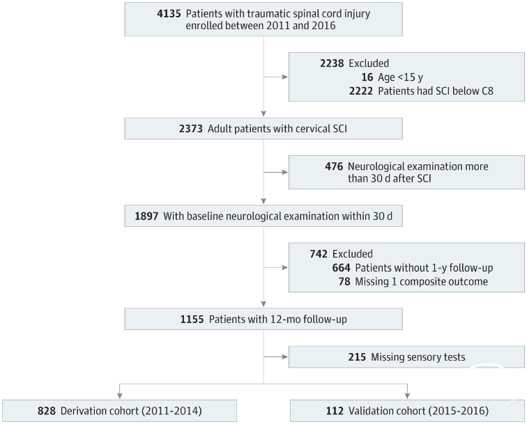 这项预后研究纳入了2011至2016年期间参加SCI模型系统(SCIMS)的2373名SCI患者,患者年龄≥15岁,神经损伤水平位于C1至C8之间,AIS分级在A至D之间。为了预测亚急性期颈椎SCI患者的预后,仅纳入了SCI伤后30天内进行基线神经功能检查并在1年随访时完成功能独立性测量(FIM)的患者,排除了脊髓损伤30天以上、AIS E级、截瘫或神经功能数据和功能结局数据缺失的患者。