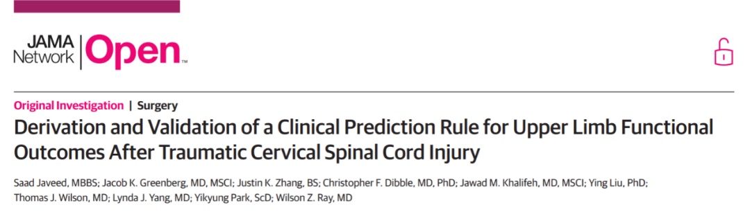 Javeed S, Greenberg JK, Zhang JK, et al. Derivation and Validation of a Clinical Prediction Rule for Upper Limb Functional Outcomes After Traumatic Cervical Spinal Cord Injury. JAMA Netw Open. 2022;5(12):e2247949. doi:10.1001/jamanetworkopen.2022.47949