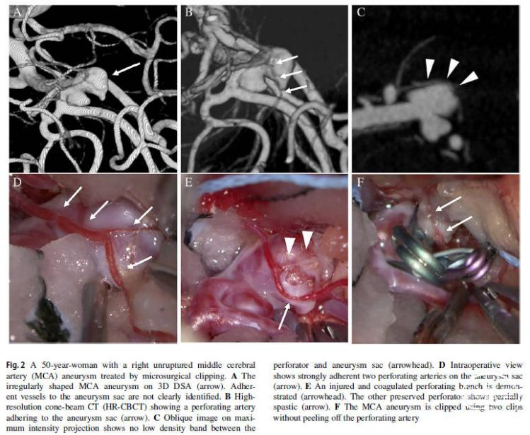 粘连血管和动脉瘤囊之间存在低密度带(low-density band),表明这些结构之间的显微外科解剖是成功和安全的。HR-CBCT能够在亚毫米水平的活体内显示MCA UIAs周围的颅内微血管。在HR-CBCT显示微血管与动脉瘤囊紧密粘连的情况下,可以考虑采用血管内方式治疗,以避免与穿支血管相关的风险。
