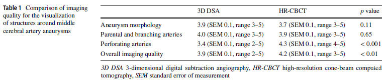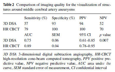 52例MCA UIA患者接受了治疗,其中43例患者采用显微手术夹闭,9例患者采用血管内治疗。HR-CBCT的总体成像质量优于3D-DSA。关于显微外科,使用HR-CBCT显示动脉瘤周围小血管的灵敏度和特异度分别为79%和100%,使用3D-DSA显示分别为57%和93%。