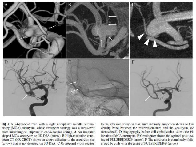 图3. 一位74岁男性,右侧大脑中动脉(MCA)动脉瘤未破裂,其治疗策略从显微外科夹闭到血管内弹簧圈栓塞