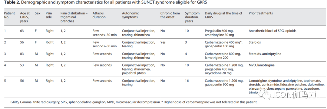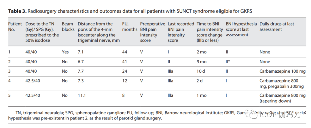 所有5例患者在GKRS治疗后数天至9个月内疼痛发作减轻,自主症状缓解。GKRS治疗后,患者平均随访26.2个月(范围8-44个月)。患者1的疼痛发作和自主症状在最后一次随访(FU)评估前没有复发,她停止了对SUNCT的药物治疗。她在GKRS治疗后44个月去世。患者2出现罕见的单发刺痛(single stabs of pain),不需要药物治疗。患者3停药后,在GKRS治疗后6个月出现单发刺痛复发,在GKRS治疗后24个月用低剂量卡马西平(100 mg/天)控制。患者4和5在GKRS治疗后分别持续了12和8个月的完全疼痛缓解,并且他们在最后一次评估时逐渐减少药物治疗。详细结果如表3所示。