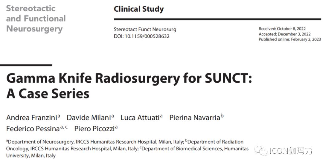 《Stereotactic and Functional Neurosurgery》杂志2023年2月 2日在线发表意大利米兰IRCCS Humanitas Research Hospital的Andrea Franzini , Davide Milani, Luca Attuati,等撰写的《伽玛刀放射外科治疗伴有结膜充血和流泪的单侧短暂性神经痛样头痛发作(SUNCT):病例系列。Gamma Knife Radiosurgery for SUNCT: A Case Series》(doi: 10.1159/000528632.)。