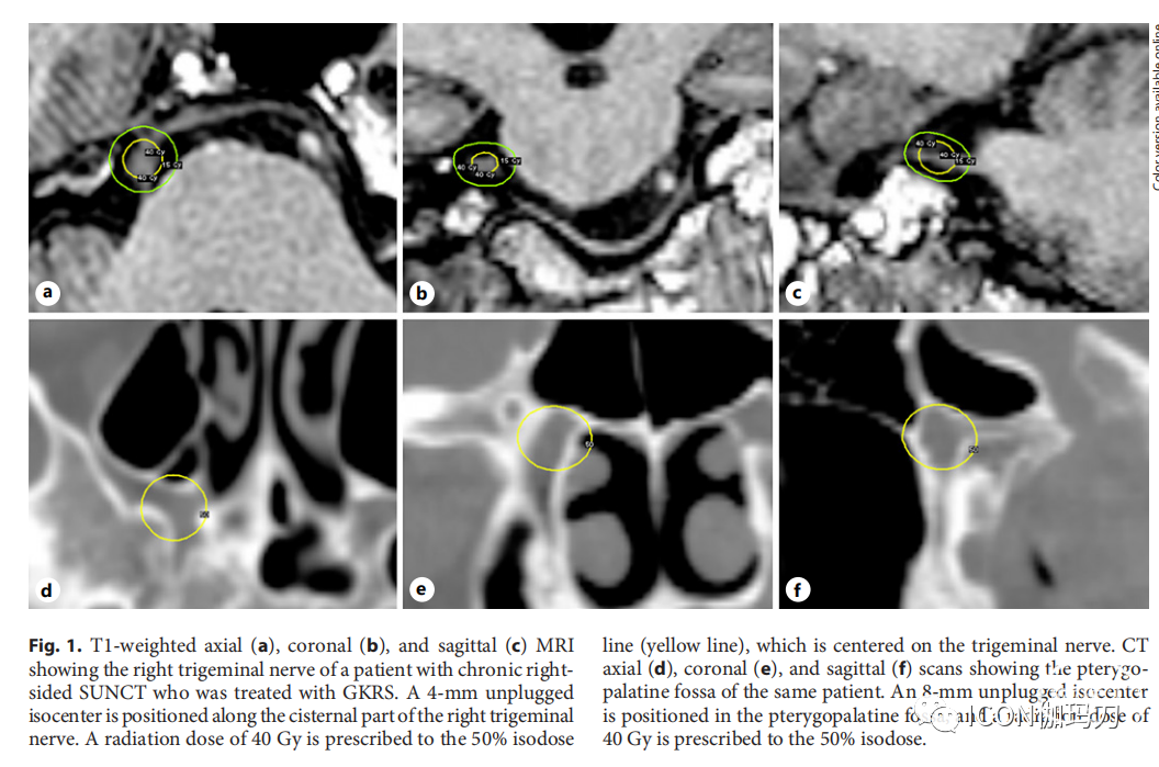 图1。T1加权轴位(a)、冠状位(b)和矢状位(c) MRI显示接受GKRS治疗的慢性右侧SUNCT患者的右侧三叉神经。沿着右三叉神经脑池段有一个4毫米的无挡块(unplugged)的等中心点。以三叉神经为中心的按50%等剂量线(黄线),照射剂量为40Gy。CT轴位(d)、冠状位(e)和矢状位(f)扫描显示同一患者的翼腭窝(the pterygopalatine fossa )。一个8毫米的无挡块的等中心点位于翼腭窝,按50%等剂量线,照射剂量为40Gy。