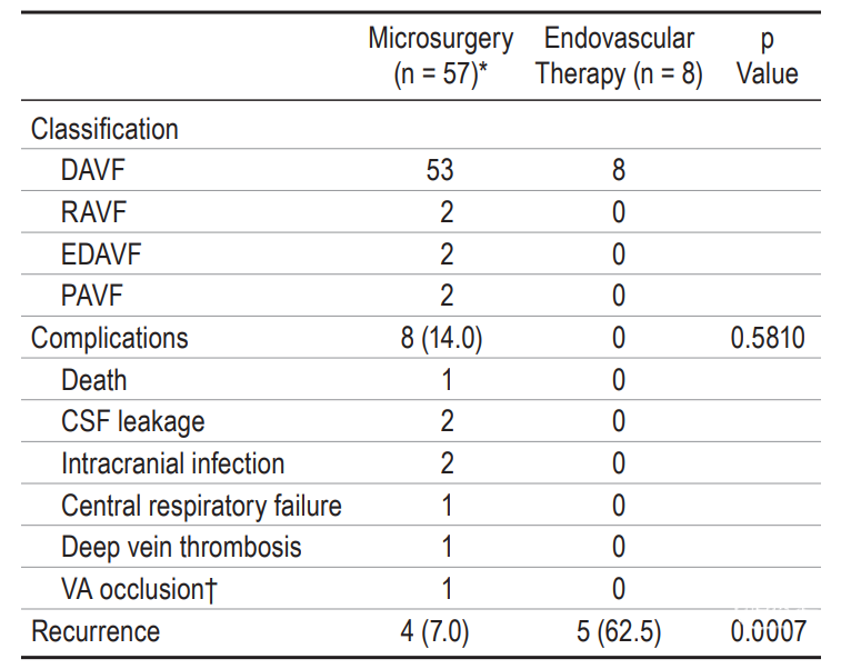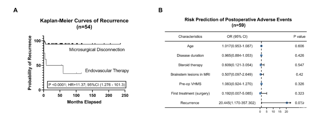 对于首次治疗,手术组的并发症发生率往往高于血管内治疗组,但差异无统计学意义(表3,p=0.5810)。一名患者在手术治疗后14天内死亡,原因考虑中枢性呼吸衰竭引起重症肺炎。多因素logistic回归分析显示,复发史会增加术后不良事件的风险(OR,20.455;95%CI,1.170-357.320;p=0.039;图6B)。55.6%(5/9)的复发患者在第二次治疗后出现不良事件。4名患者出现急性神经功能恶化,其中3名首次治疗为血管内治疗。两名首次治疗为手术治疗的患者发生了颅内感染。
