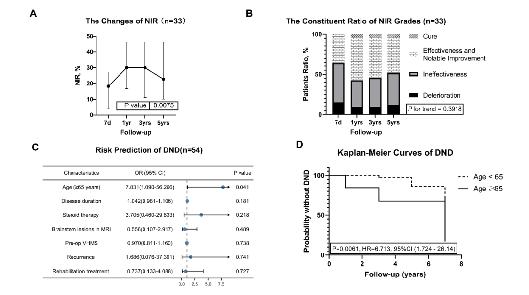 综上所述,本研究是对静脉高压性脊髓病临床特点和长期随访的重要更新。我们总结了颅颈交界区静脉高压性脊髓病的独特临床特征,并提出了新的静脉高压性脊髓病评分量表。主要结局揭示,超过四分之一的患者出现迟发性神经功能恶化。首次就诊时65岁以上患者发生迟发性神经功能恶化的风险增加了8倍。栓塞再通是复发的原因之一,但也应重视对侧供血的新发瘘口。而且无论初始治疗方案如何,二次治疗的术后并发症风险都增加了20倍。所以这类患者在经验丰富的中心争取一次性解剖治愈是合理的。