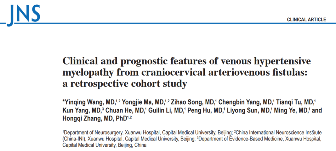 Wang Y, Ma Y, Song Z, Yang C, Tu T, Yang K, He C, Li G, Hu P, Sun L, Ye M, Zhang H. Clinical and prognostic features of venous hypertensive myelopathy from craniocervical arteriovenous fistulas: a retrospective cohort study. J Neurosurg. 2023 Jan 13:1-11. doi: 10.3171/2022.11.JNS221958. Epub ahead of print. PMID: 36640099.