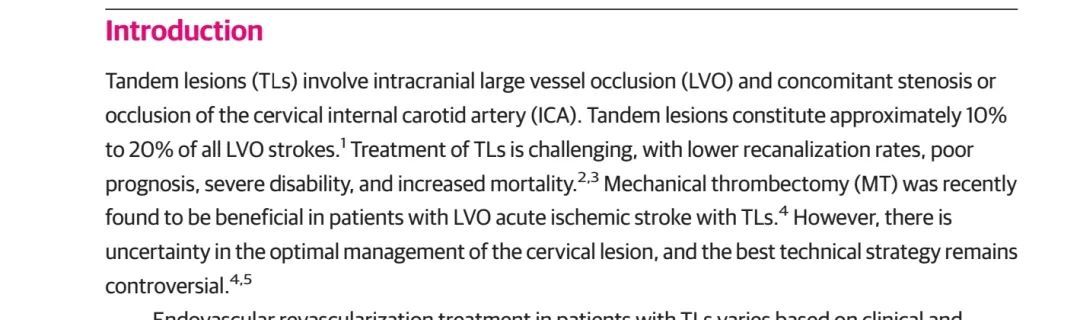 串联病变(TLS)包括颅内大血管闭塞(LVO)和伴发的颈内动脉(ICA)狭窄或闭塞。串联病变约占所有LVO卒中的10%至20%。