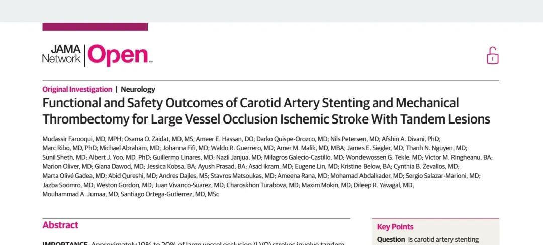 这项多中心、国际横断面研究的结果表明,对于伴有TLS的急性缺血性卒中患者,在MT治疗颅内LVO期间对颅外颈部病变进行支架置入术可能是一种有效且安全的治疗方法。颈动脉支架置入术在不增加出血和死亡率的情况下,显著增加了良好预后和成功血运重建的几率。