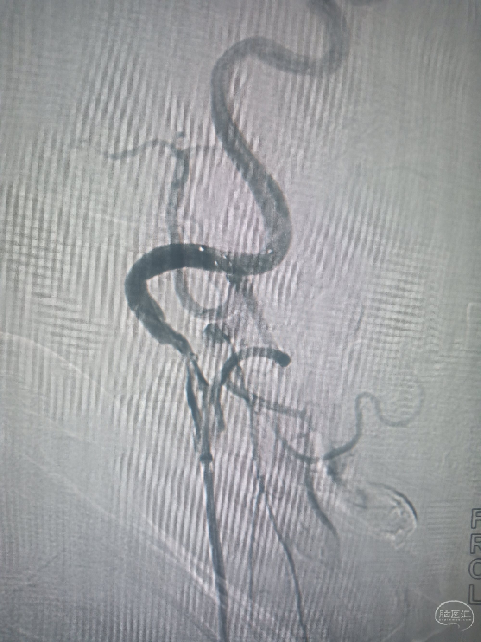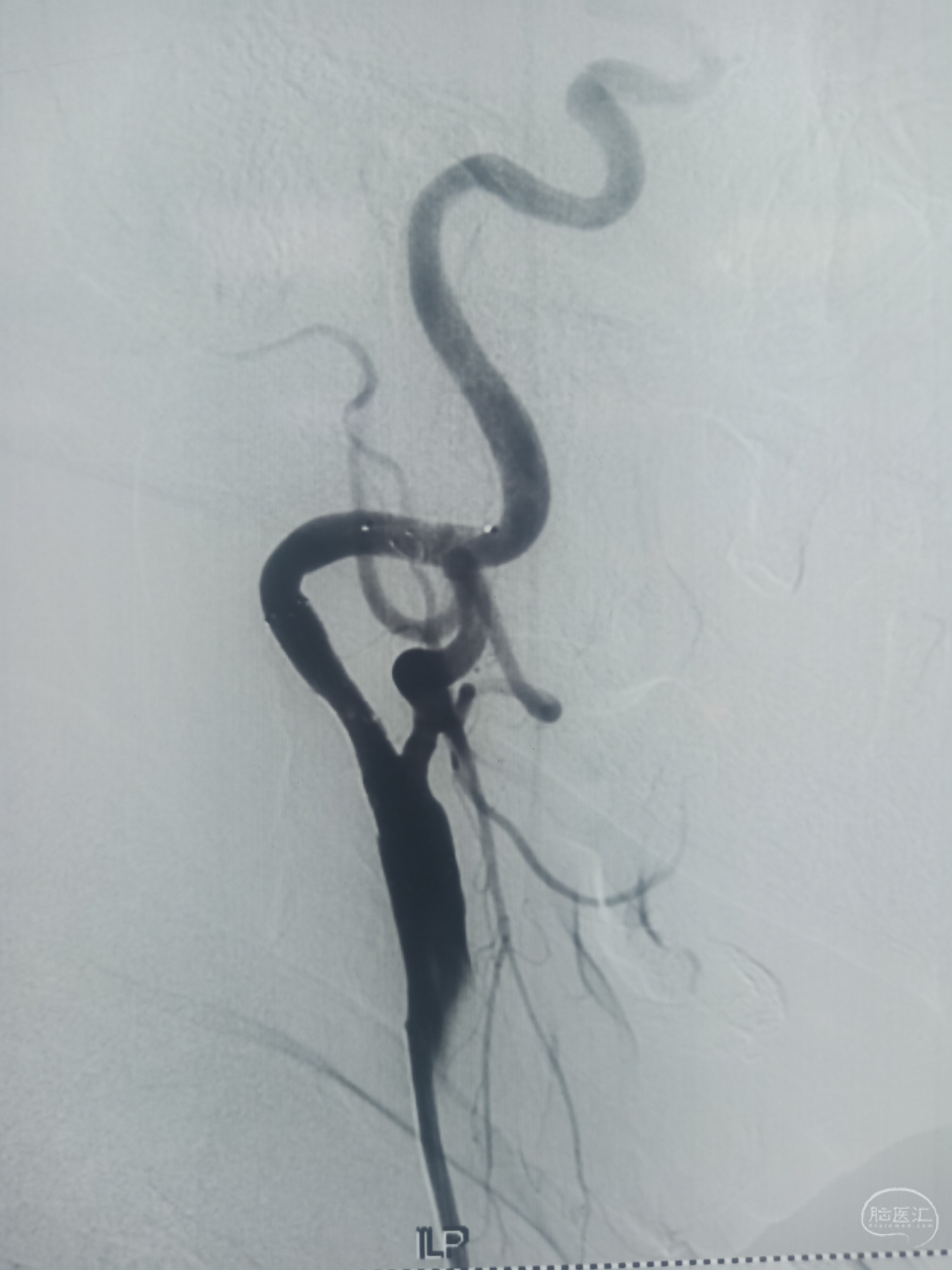 脑血管造影显示:左侧颈内动脉轻度狭窄,右侧颈内动脉起始部重度狭窄约80%。