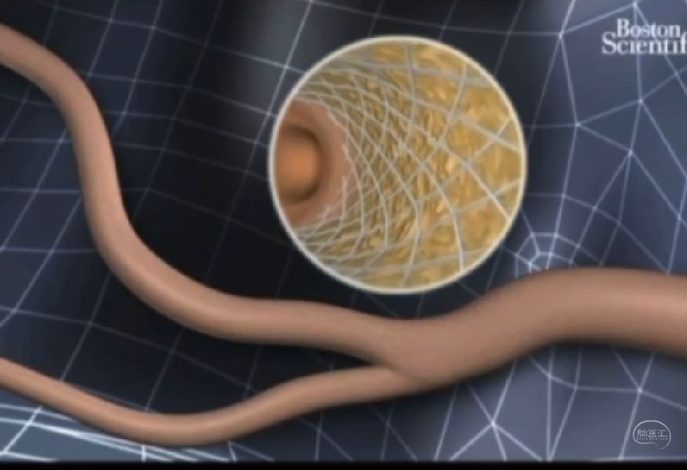 将单弯导管沿保护伞🌂导丝穿越支架后回拉保护伞至单弯导管内撤出体外。