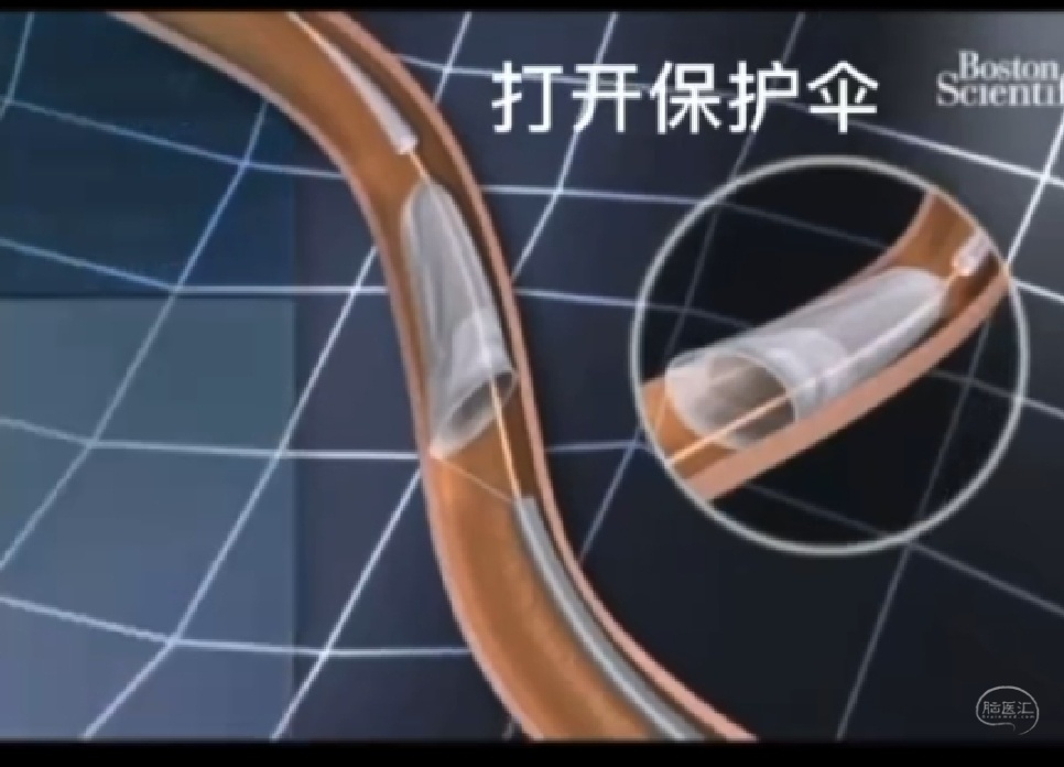 向前推进保护伞导丝,使保护伞到保护导管头端。