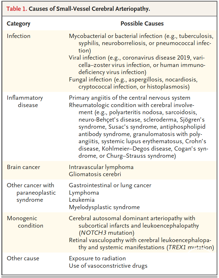 诊断方法:这位患者可能患有小血管脑动脉病。小血管脑动脉病的鉴别诊断很广泛(表1)。特定动脉病的诊断取决于患者的年龄、家族史、进展速度、全身体征(如皮肤和视网膜病变)和脑外神经功能缺损(如神经病变)的存在、脑和血管成像特征以及诊断检查的结果等因素,包括炎症和癌症生物标志物检测、基因检测、脑脊液(CSF)分析、皮肤、颞动脉和大脑活检。
