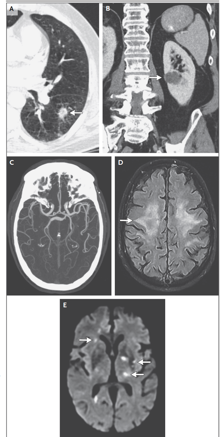 脑脊液淋巴细胞增多症和颅内血管壁MRI结果与血管炎的诊断一致。结合肺部活检结果,该发现与肺腺癌相关的副肿瘤性中枢神经系统血管炎的临床诊断最为一致。对中枢神经系统血管炎进行了免疫抑制治疗。患者接受了5天的静脉注射甲基强的松龙,随后每天口服泼尼松。接受了一剂静脉注射环磷酰胺,并计划进行额外治疗。由于他的心房颤动病史、新发现的癌症以及潜在高凝状态的可能性,抗凝治疗得以继续。患者在住院期间接受了静脉注射肝素治疗。出院前,治疗过渡到依诺肝素,并监测因子Xa水平,以确认已建立治疗状态。由于冠状动脉疾病史,低剂量阿司匹林治疗仍在继续。在与肿瘤学和放射肿瘤学团队协商后,我们计划对肺腺癌进行放射治疗,对肾肿瘤进行观察。