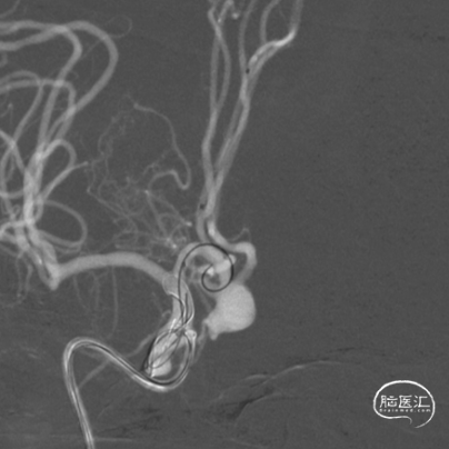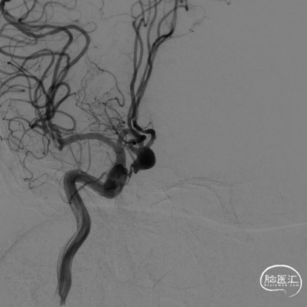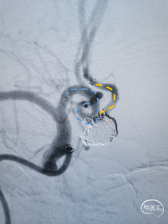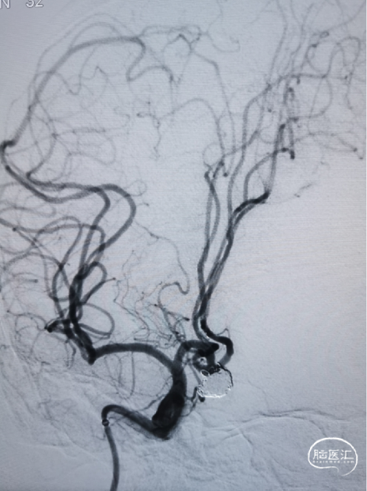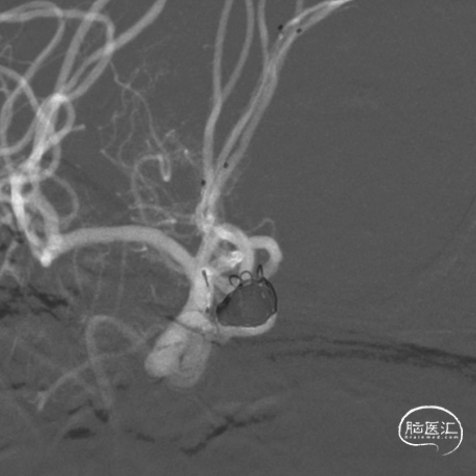 造影示“T”型支架左侧Atlas支架 3mm*15mm 、右侧 Atlas支架 4mm*21mm,动脉瘤致密栓塞,不显影。双侧A2段显影良好。