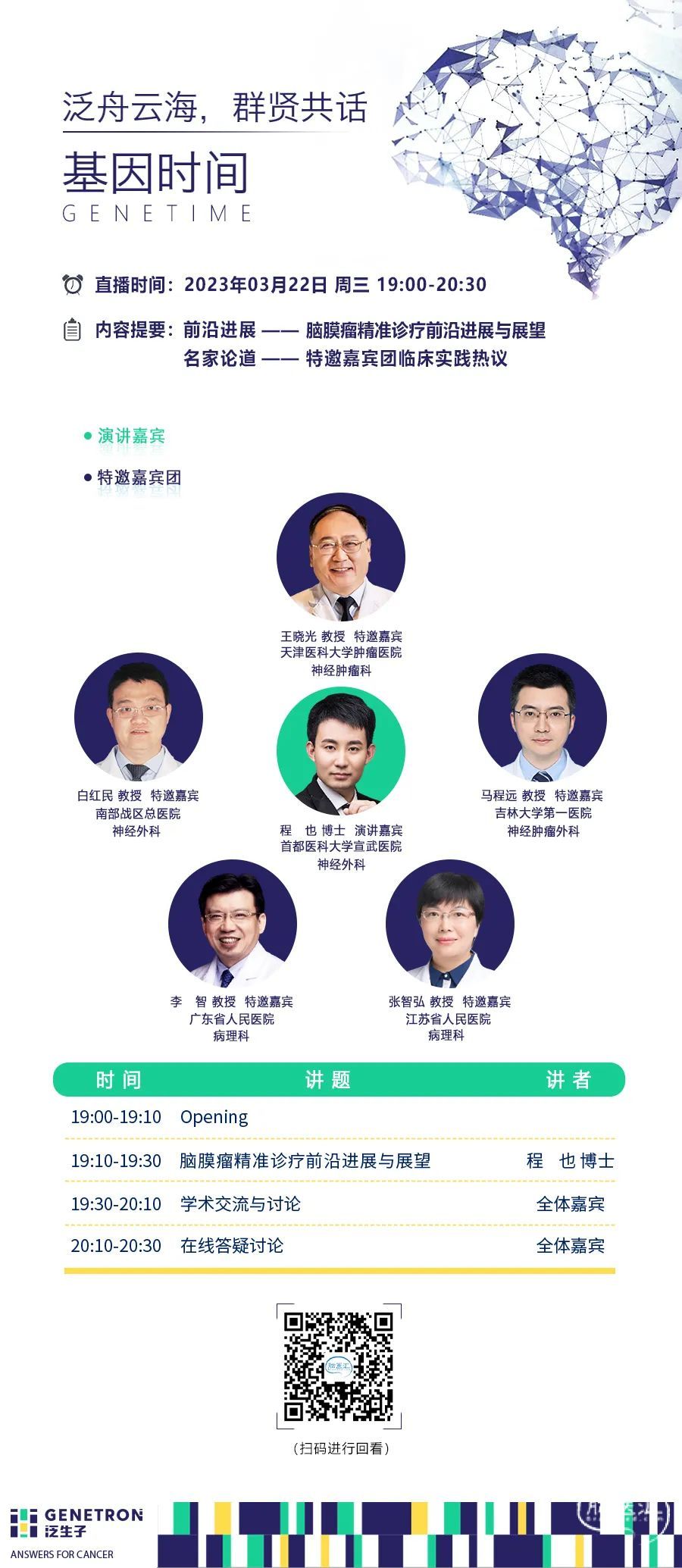 本期“基因时间”采用特邀嘉宾团与优秀中青年专家在线对话的形式,分享脑膜瘤精准诊疗前沿进展要点及引发的思考,充分展示中青年专家的学术风采,并融入多学科专家们高屋建瓴的点评与观点。