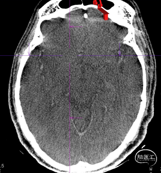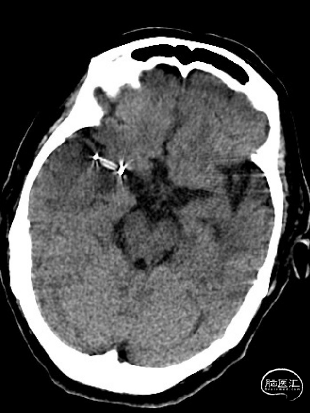 术后第一天复查颅脑CT未见异常染色及大面低密度病灶。