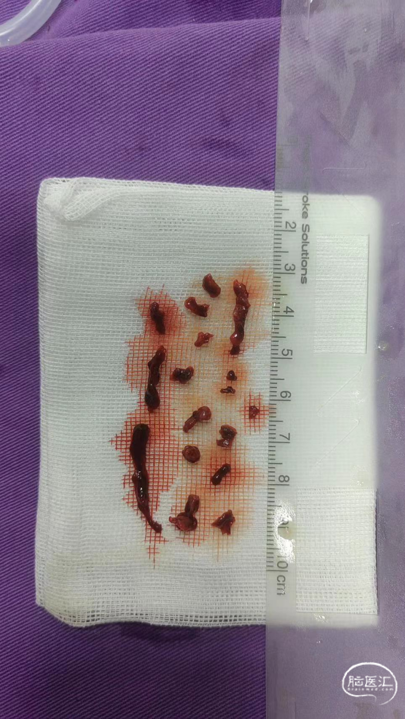 将Catalyst7 132中间导管经导引导管送至于RICA C1段起始部闭塞处,采用ADAPT技术自C1段至C4段反复抽吸取栓,取出大量暗红色血栓。