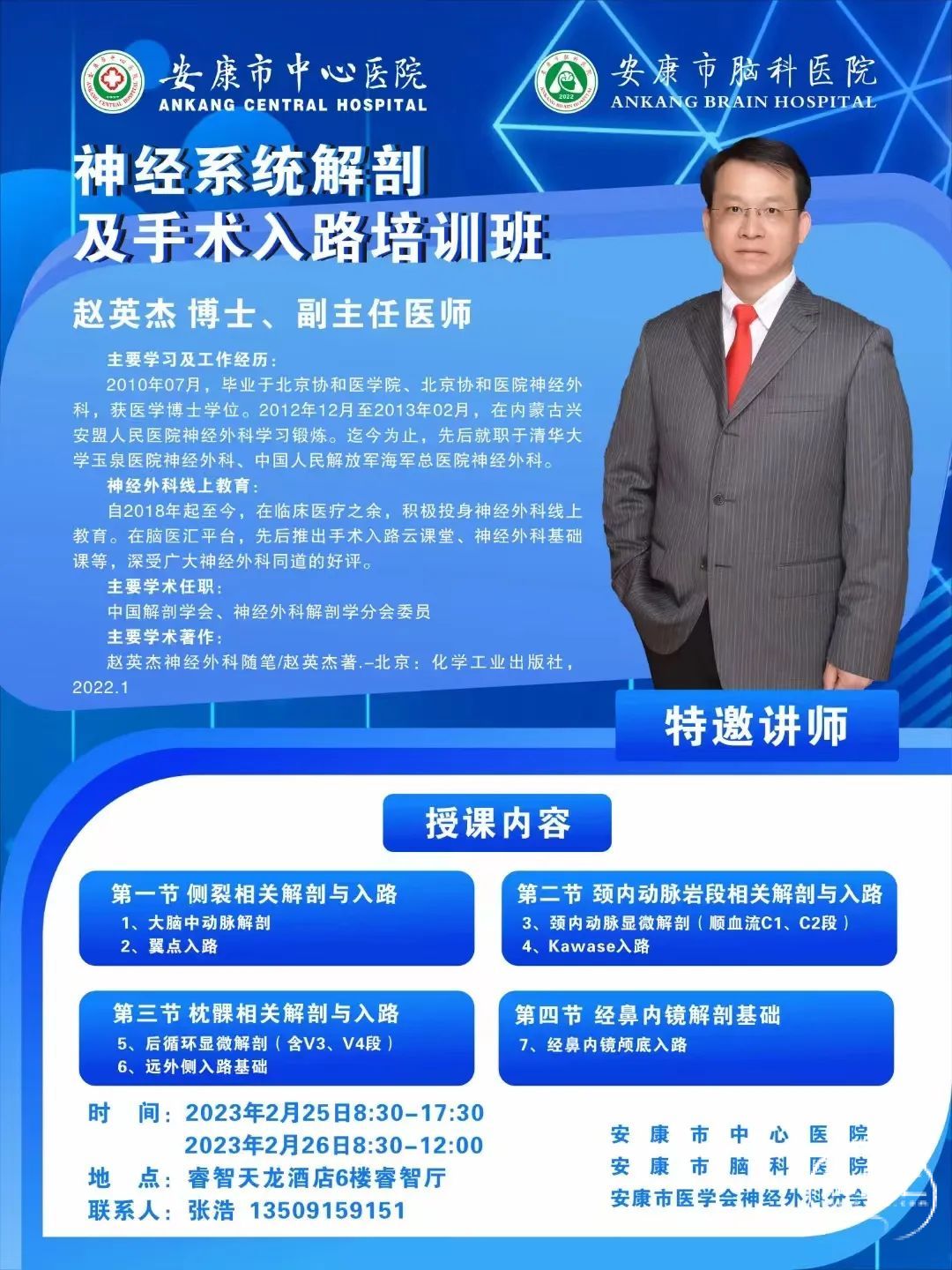 2月25日-26日,为期两天的“神经系统解剖及手术入路培训班”在安康顺利落幕,本次培训班由安康市中心医院、安康市脑科医院、安康市医学会神经外科分会联合主办,旨在进一步提升我市神经外科诊疗水平,更好的服务广大病患,培训班特邀请国内著名学者、中国解剖学会神经外科解剖分会委员、脑医汇云课堂优秀讲者赵英杰老师亲自授课,市中心医院副院长、市脑科医院院长李东波出席会议并讲话,安康神经外科各位从事神经外科及相关专业的医务人员约40人参加会议,会议由李东波院长和市脑科医院副院长、神经外科大主任杨涛共同主持。