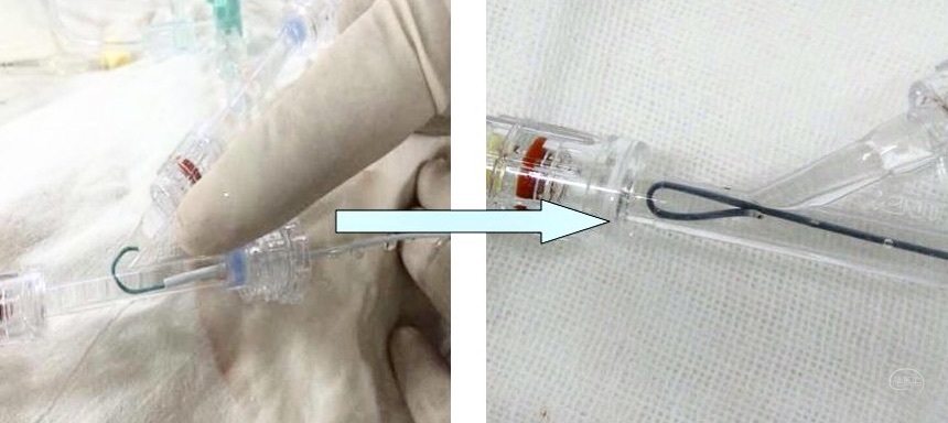 如何成襻?两种方式,一是体内成襻,即利用载瘤动脉的管腔和生理弯曲,配合旋转手法,使微导管在血管内折返成襻(类似Simmon II造影管在主动脉弓内折返成问号形的操作),后面的两个实战病例都是使用该方式。二是体外成襻,即利用Y阀空间将微导管在体外成襻后送入血管内,感谢李聪慧大侠供图: