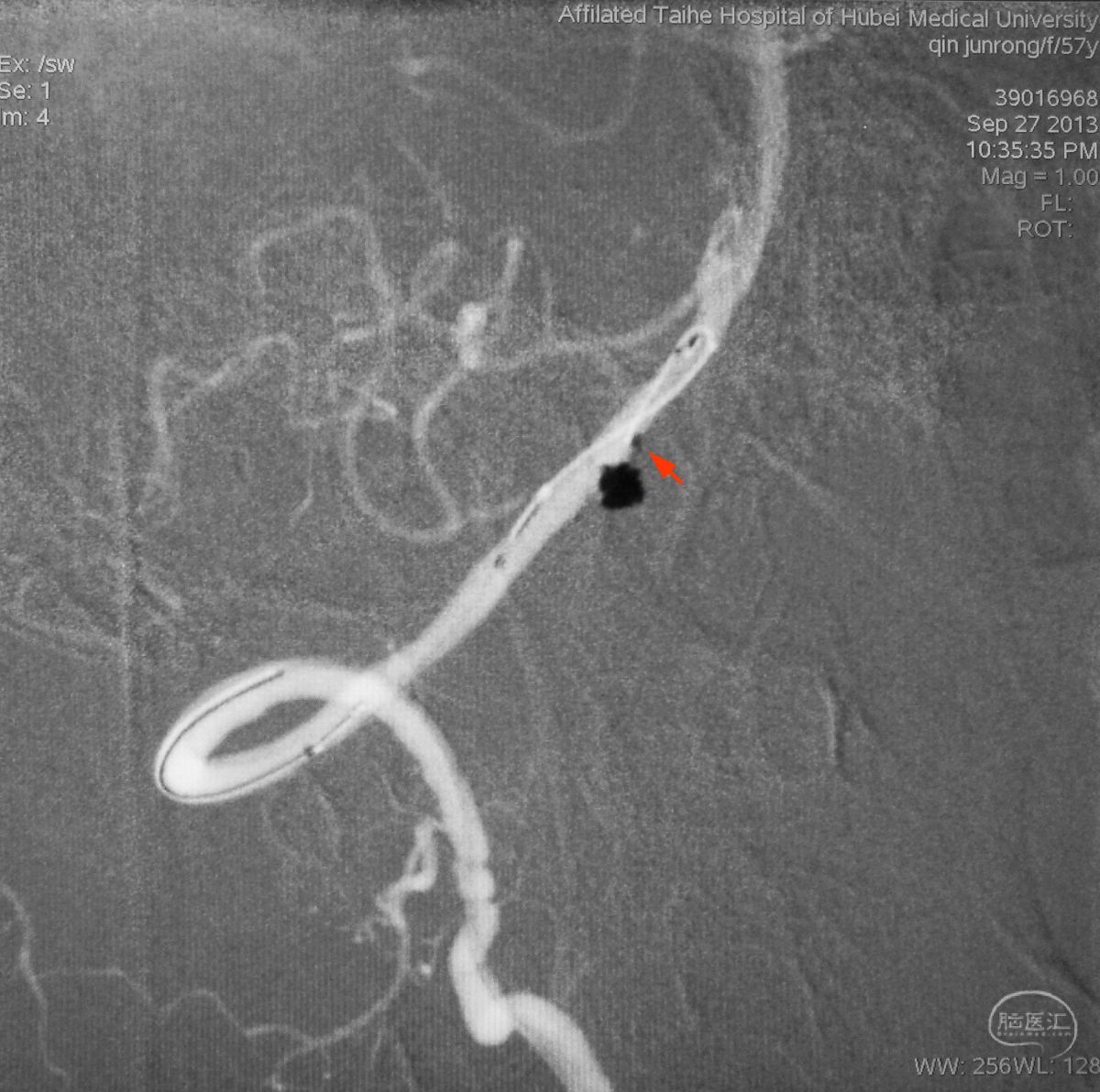依次送入QC-2-4-3D,2-3-Helix,1.5-2-Helix,1.5-2-Helix四枚弹簧圈,最后一枚弹簧圈将管头(箭头)顶出瘤腔。