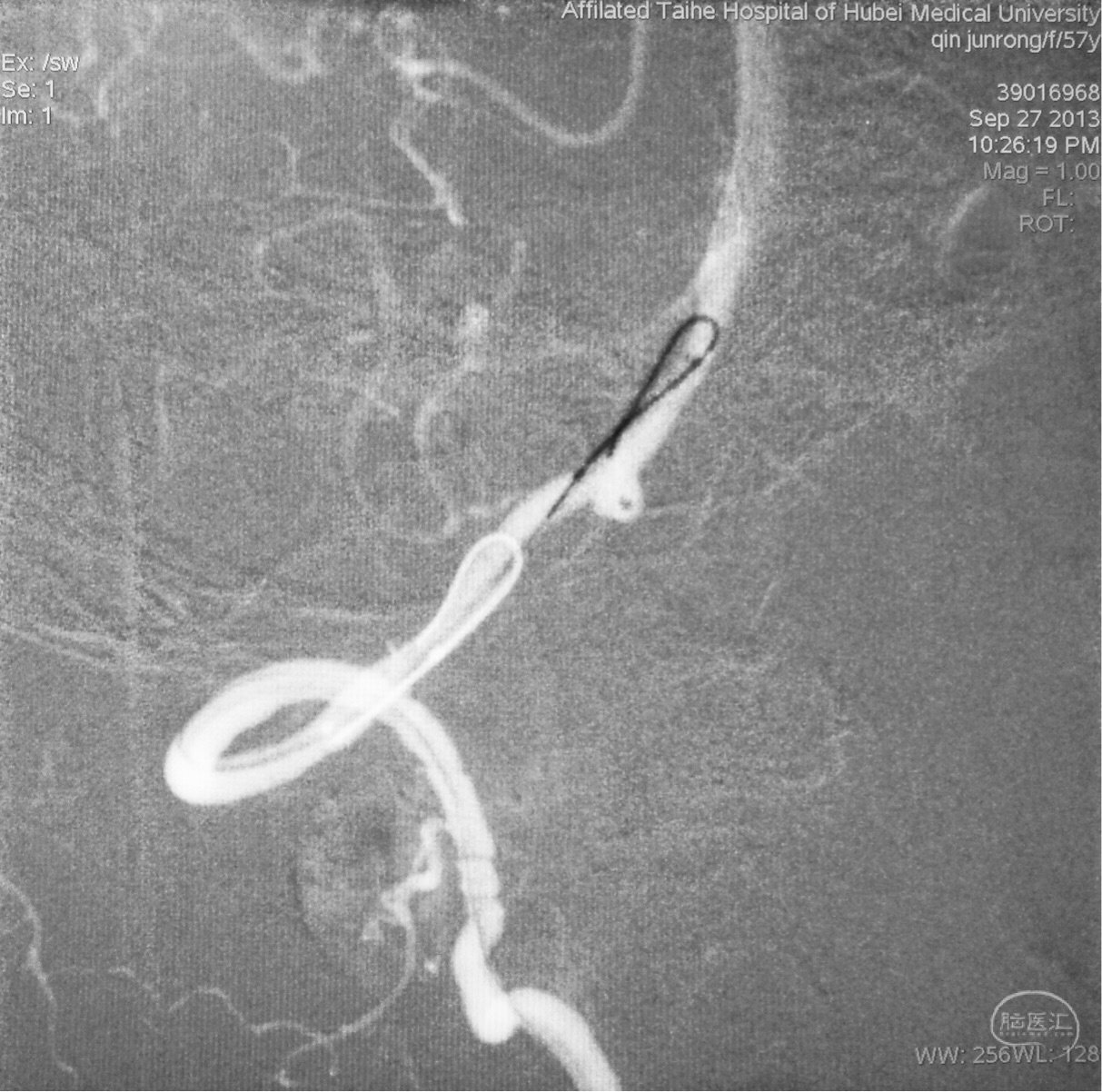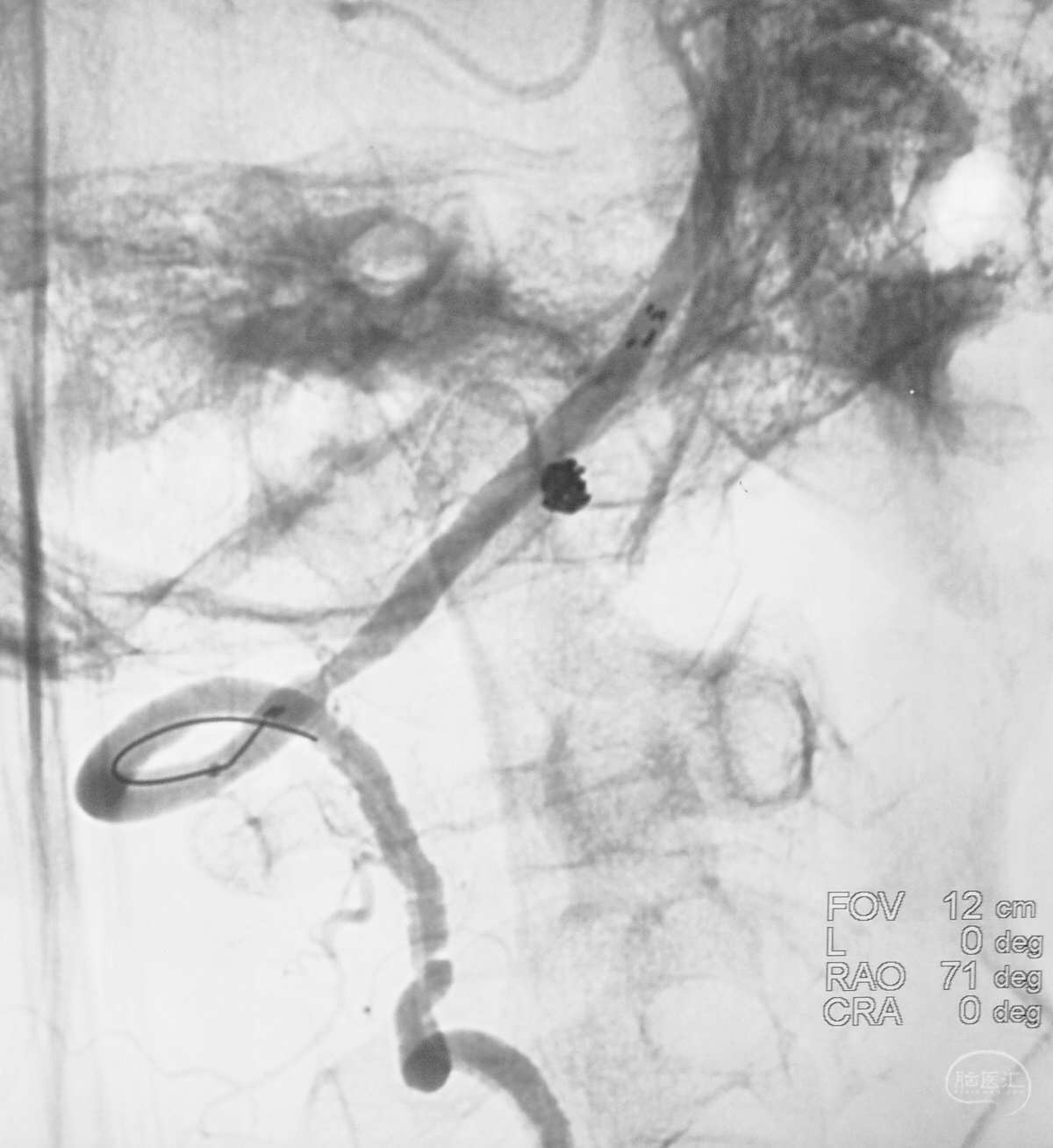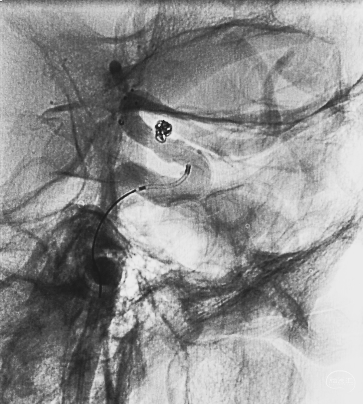 微导管撤出后,完全释放Solitaire支架,可见突入载瘤动脉的弹簧圈被压回瘤腔。